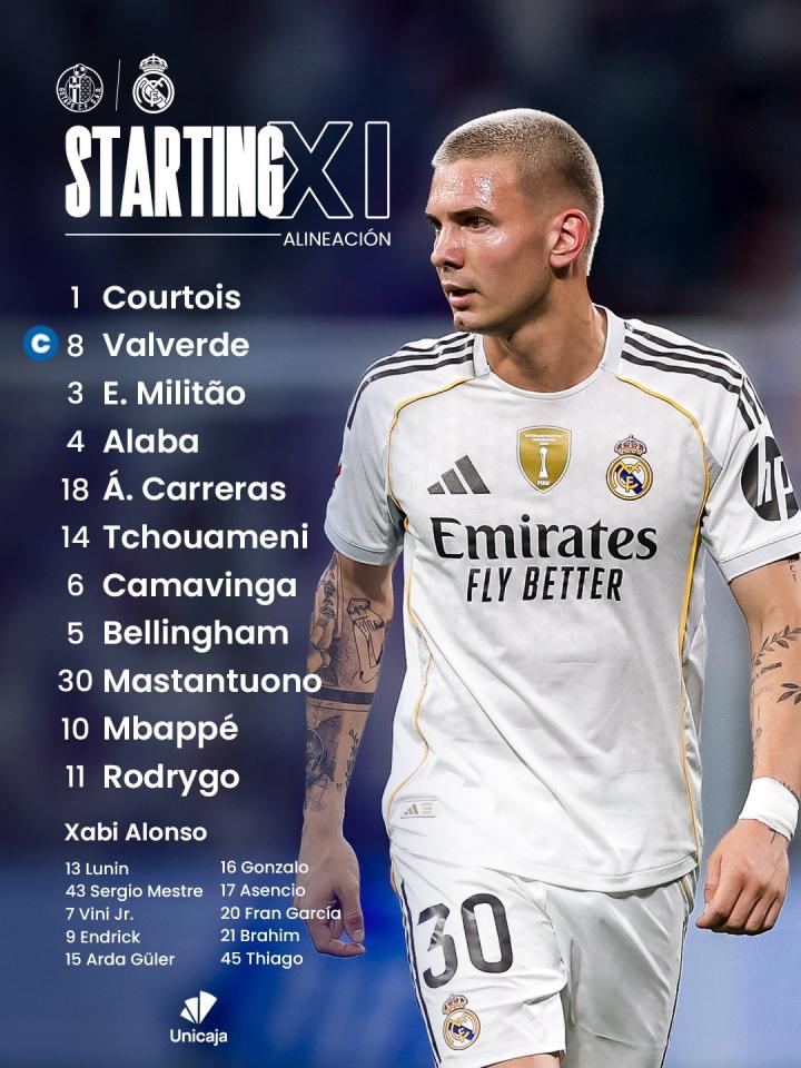 赫塔费首发:13号戴维-索里亚这位门将,怕是要被皇马射成筛子;21号胡安-伊格莱西亚斯、22号多明戈斯-杜阿尔特、2号杰内组成的后防线,简直像三堵会移动的豆腐墙;16号迭戈-里科和17号费梅尼亚这对边后卫,估计连皇马球员的衣角都摸不到;6号马里奥-马丁、5号米利亚、8号阿兰巴里组成的中场,怕不是要上演"如何优雅地被过掉"的教学片;18号阿莱士-圣克里斯和23号阿德里安-利索这对锋线组合——哦,他们可能需要先学会怎么把球踢进对方半场。